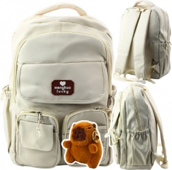 Aspectul rucsacului este completat de insigne decorative cu motive de capibara și un breloc de pluș în formă de capibara, pe care copilul îl poate fixa după bunul plac și personaliza astfel aspectul rucsacului său.