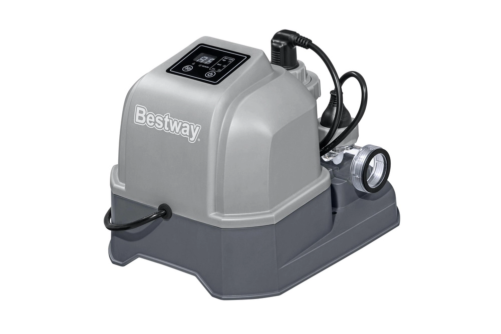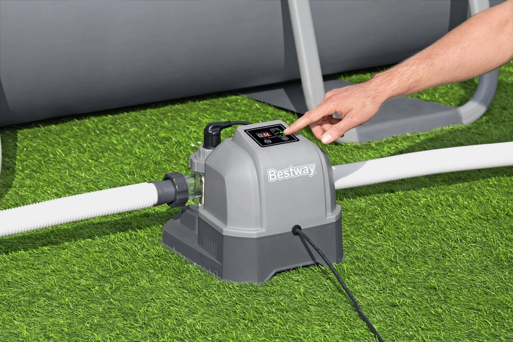 Generatorul de clor Bestway oferă o soluție pentru cei care doresc să mențină apa din piscină curată, fără a folosi clor clasic. Aparatul transformă sarea în clor natural, curățând eficient apa și distrugând bacteriile. Baia este mai confortabilă, fără iritații ale ochilor și pielii.