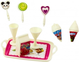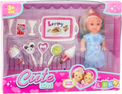 Setul include o păpușă de 12 cm îmbrăcată într-o rochie albastră cu imprimeuri drăguțe și accesorii tematice precum acadele, înghețate, cornete și un platou cu gustări. Aceste accesorii nu doar că îmbogățesc jocul, dar și susțin dezvoltarea imaginației, abilităților manuale și competențelor sociale ale copilului.