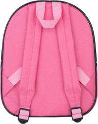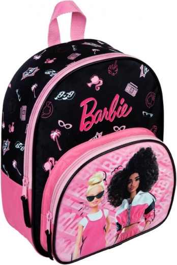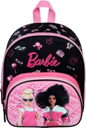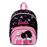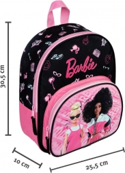 Rucsacul cu motiv Barbie oferă un aspect atrăgător în combinația de culori roz-negru cu imagini ale păpușii îndrăgite.