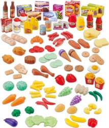 Setul include: 120 de elemente diverse, inclusiv fructe, legume, produse de patiserie, gustări, băuturi și ambalaje.