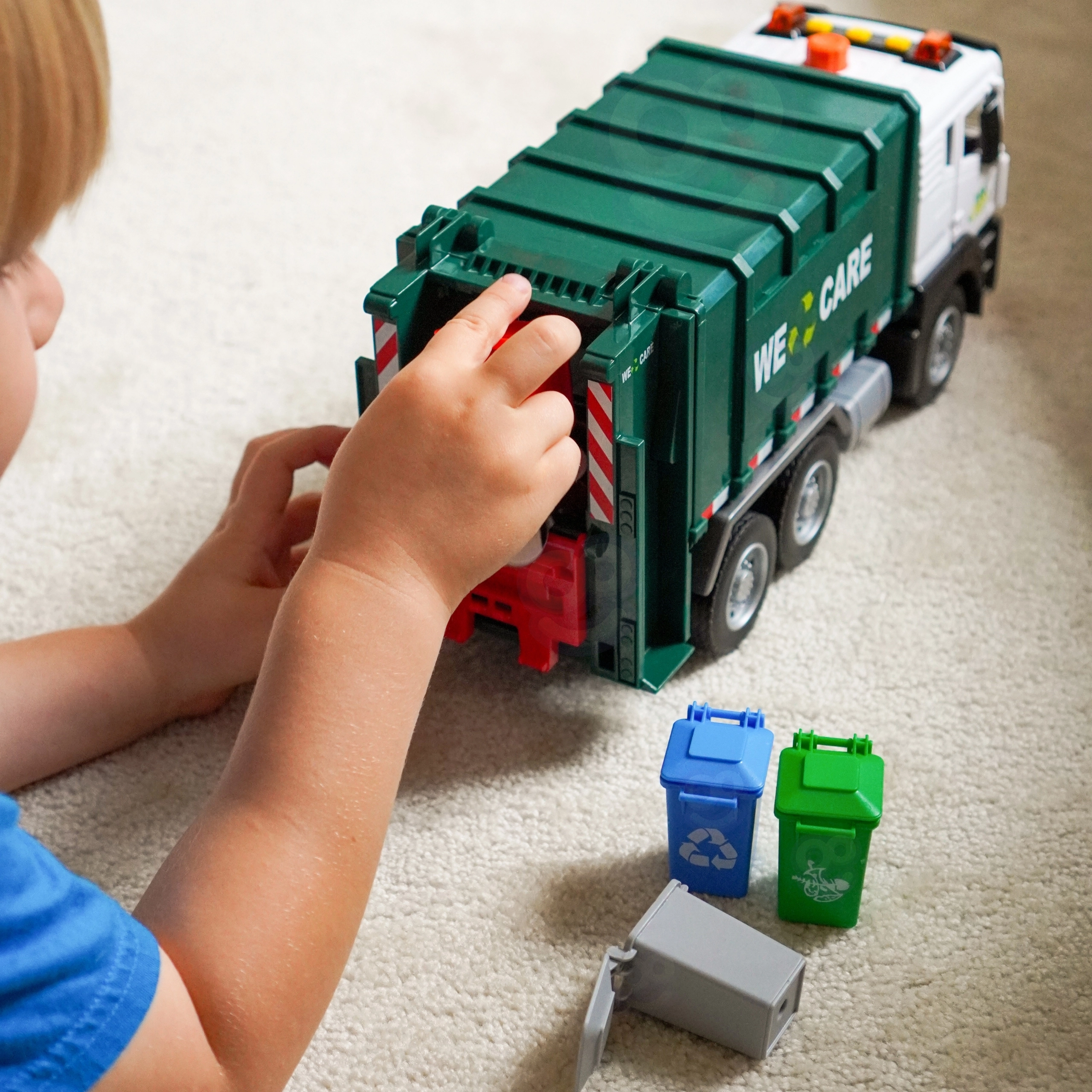 Mașina este echipată cu lumini și sunete pentru o implicare și mai mare. În pachet găsiți 4 coșuri colorate și un set de cartonașe cu deșeuri, care îi ajută pe copii să înțeleagă ce și unde se aruncă. Potrivită pentru joaca zilnică acasă și la grădiniță.
