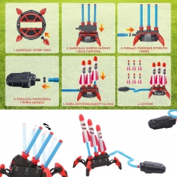 - bază cu lansator, pompă elastică de picior cu furtun, 6× rachetă din spumă (dimensiuni diferite)