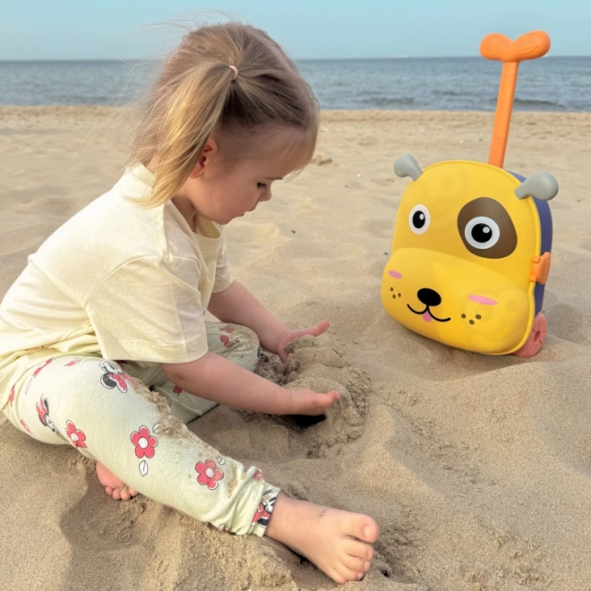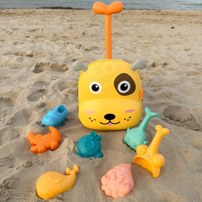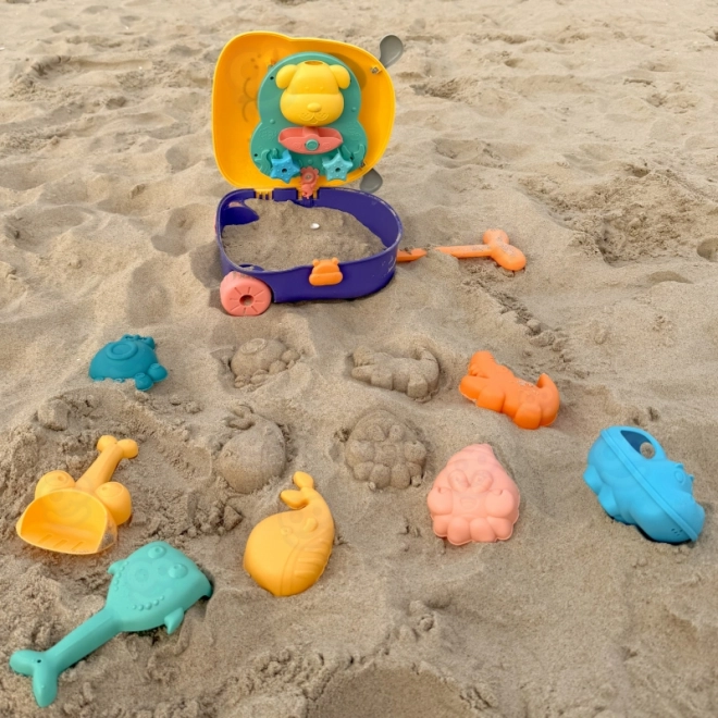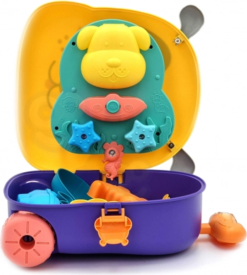 Această valiză portabilă se transformă într-o mică ladă cu nisip și apă, care îi va distra pe copii acasă, în grădină sau pe plajă. Datorită accesoriilor bogate, copiii se vor bucura de creații din nisip și, în același timp, de descoperirea efectelor apei. Jucăria susține motricitatea fină, creativitatea și percepția senzorială.