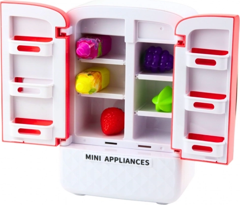 Frigiderul jucărie impresionează prin funcțiile sale inovatoare și posibilități. Conține fructe colorate, sticluțe pentru sucuri și rafturi la dispoziția nestructurată în interior, oferind copiilor dezvoltarea creativității și învățarea organizării. Este ideală și pentru simularea scenariilor reale din viață.