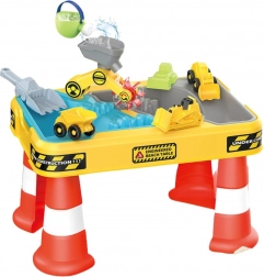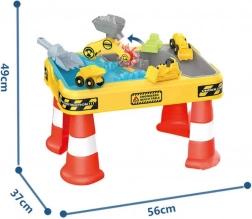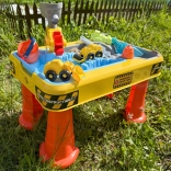 Masa mare cu tematică de șantier aduce copiilor ore întregi de joc senzorial și creativ. Compartimentarea dublă permite umplerea separată cu apă și nisip, astfel încât micii constructori pot încerca să sape, să toarne, să verse și să conducă vehicule. Datorită picioarelor „tip con de trafic”, masa este solidă și sigură pentru utilizare atât în exterior, cât și în interior.