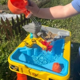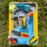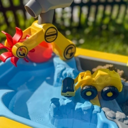 Compartimentarea dublă permite jocul simultan cu apă și nisip – ideal pentru explorare senzorială și scenarii nesfârșite de joacă pe șantier.