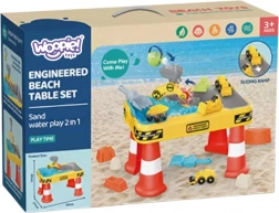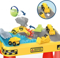 Sunt incluse 4 mini mașinuțe de construcții (excavator, betonieră, basculantă, buldozer), macara rotativă, pistă pentru vehicule, rampe și roată cu apă și accesorii practice pentru nisip și apă (stropitoare, lopățică, greblă, forme). Construcția simplă asigură montaj rapid fără unelte și curățare ușoară după joacă.