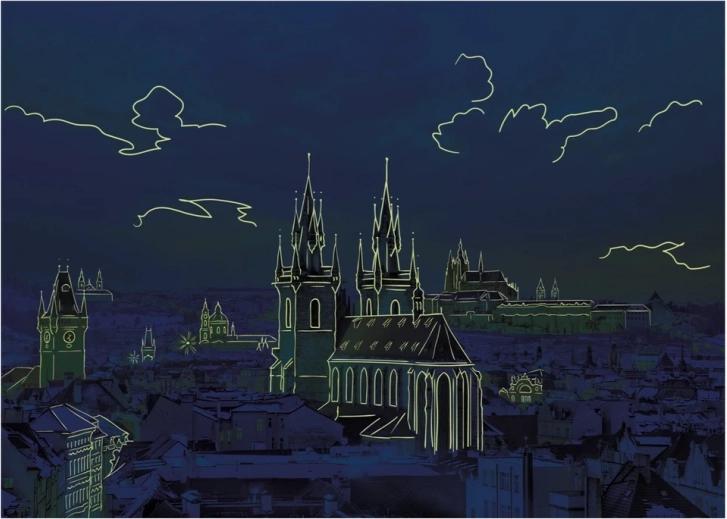 Puzzle neon Vedere spre Hradčany, 1000 de piese. Strălucește în întuneric, producție cehă, carton rezistent și tăiere laser precisă. Cadou și decor ideal.