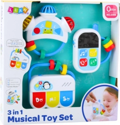Setul de jucării muzicale 3în1 este atât distractiv, cât și educativ pentru copii. Fiecare instrument inclus - telefon muzical, clape și tamburină - este conceput pentru a sprijini dezvoltarea auzului, motoricii și abilităților manuale încă de la o vârstă fragedă. Setul oferă diverse sunete, melodii și moduri, permițând copiilor să pătrundă în lumea fascinantă a muzicii.