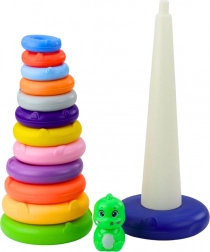 Această jucărie este formată dintr-o bază solidă și stabilă, un stâlp înalt și 13 inele colorate de mărimi diferite. Toate elementele sunt realizate din plastic ușor și durabil, fiind sigur pentru copiii mici. Partea superioară a turnului este decorată cu o figurină de dinozaur drăguț, care atrage atenția copiilor și îi încurajează să continue să se joace.