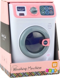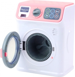 Mașina de spălat pentru copii se pornește cu butonul ON/OFF de pe panoul tactil. Alegeți unul dintre programele disponibile și mașina va începe să funcționeze - veți auzi sunetul turnării apei și tamburul se va roti, ca la o mașină de spălat reală. O altă atracție este tamburul frontal care se deschide și sertarul extensibil pentru detergent, pentru un joc și mai realist.