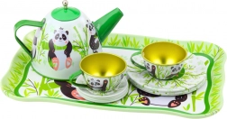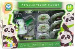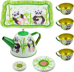 Setul de ceai metalic pentru copii cu motiv de panda este ideal pentru micii iubitori ai ceaiului. În pachet găsiți un ceainic, patru cești, farfurioare și farfurii. Fiecare element este decorat cu imagini vesele de panda și bambus în culori verde-alb, oferind copiilor o experiență de joc distractivă și colorată.