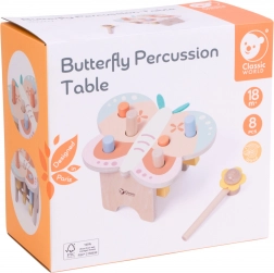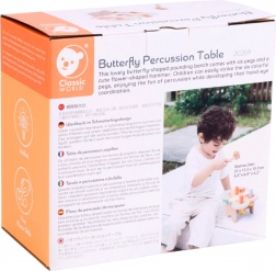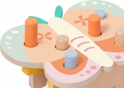 Măsuța de lemn în formă de fluture este ideală pentru jocurile copiilor, care încurajează curiozitatea și descoperirea de sunete. Această formă de joc colorată și atrăgătoare susține dezvoltarea abilităților motorii și coordonarea mână-ochi. Setul include un ciocan în formă de floare, care adaugă farmec și invită copiii la joacă activă.