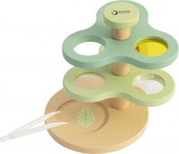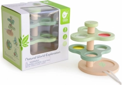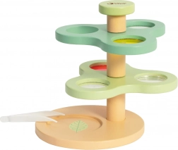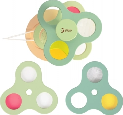 Jucăria este fabricată din lemn lăcuit și vopsită cu culori netoxice, ceea ce asigură siguranța pentru copii și minimizează impactul asupra mediului.