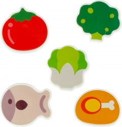 Tabla include și 5 magneți colorați în formă de alimente, care ajută copiii să recunoască diferite tipuri de mâncare.