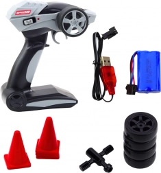 Iluminarea LED, inclusiv lumini frontale, spate și de șasiu, adaugă autenticitate și stil. Telecomanda cu frecvența de 2,4 GHz asigură cuprinderea până la 25 de metri cu reacție imediată. Setul extra de pneuri și conurile pentru drift vă permit să vă creați propria pistă de curse.