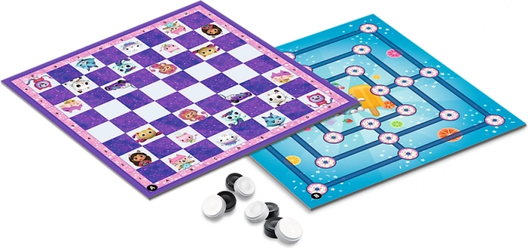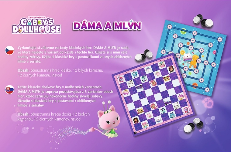 Acest set distractiv combină jocurile clasice dame și mori cu lumea magică a căsuței lui Gabby. Datorită tablei de joc cu două fețe și numeroaselor variante, te vei întoarce des la ele. Reguli simple și pregătire rapidă asigură că poate juca oricine – copii și adulți.