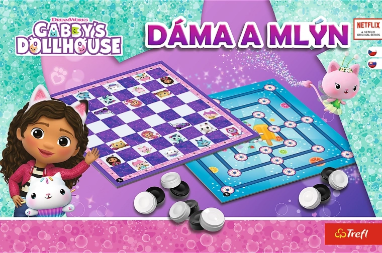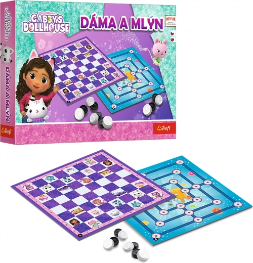 Dame și mori – Căsuța magică a lui Gabby de la Trefl. Tablă cu două fețe, 5 variante pentru fiecare joc, 24 de piese și instrucțiuni. Strategie distractivă pentru familie, pentru copii și adulți.