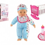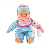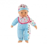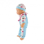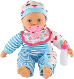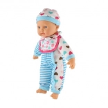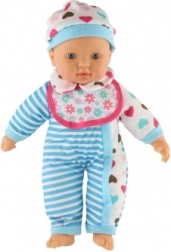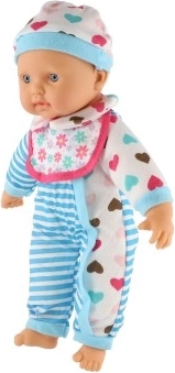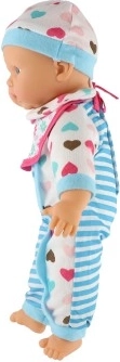 Păpușa este îmbrăcată într-o rochiță în dungi alb-albastre cu inimioare drăgălașe. Este dotată cu suzetă și biberon, adăugând un element realist jocului.