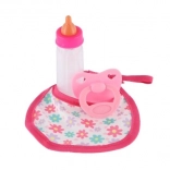 Pachetul include, de asemenea, o suzetă, un biberon și un bavețik cu motive florale, care completează impresia generală a îngrijirii păpușii.