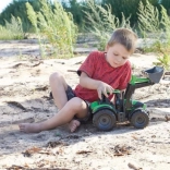 Acest tractor detaliat cu remorcă este ideal pentru joacă în nisipar, în grădină sau în casă. Încărcătorul frontal funcțional permite încărcarea ușoară a nisipului sau a materialelor mărunte, iar remorca basculabilă asigură transportul și descărcarea confortabilă a încărcăturii. Roțile mari, profilate, și axele metalice de 6 mm oferă stabilitate și rezistență chiar și în timpul jocului intens.