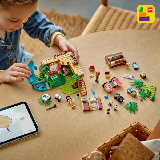 LEGO Friends Îngrijirea panda în rezervație: căsuță în copac, ATV, 2 mini-păpuși și 3 pande. 243 piese pentru povești creative despre prietenie și îngrijirea animalelor.