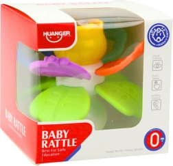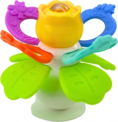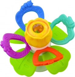 Partea centrală rotativă a florii stimulează copilul la activitate și întărirea mâinilor. Petalele colorate sunt fabricate dintr-un material moale, elastic, potrivit pentru a fi mușcate – ideală în perioada de dentiție. Îmbogățită cu bile mici în interiorul florii, care zgomotesc ușor la mișcare, stimulează auzul și văzul copilului.