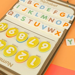 Posibilități educative: În interiorul genții veți găsi pagini din fetru pentru cusut, carduri educative cu litere și numere, și o tablă de șters pentru activități creative.
