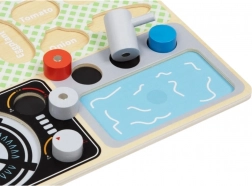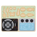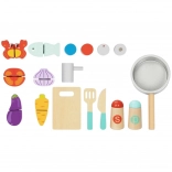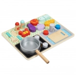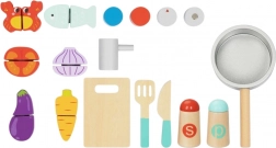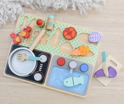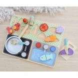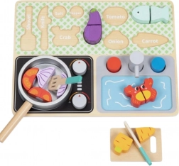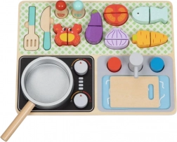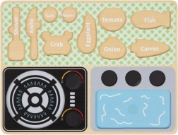 Acest set magic de bucătărie din lemn este destinat copiilor de la 3 ani. Datorită plăcii practice, copiii învață numele legumelor, ustensilelor de bucătărie și altor obiecte legate de gătit și mâncare. Fabricat din lemn de înaltă calitate, acest set este rezistent și sigur pentru copii.