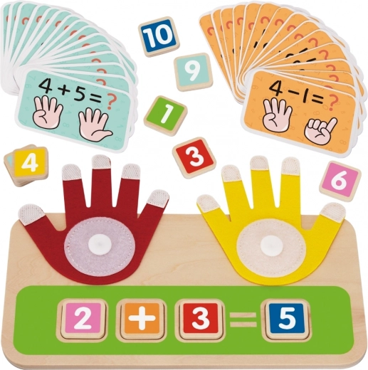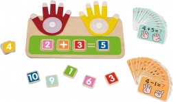 - Bază din lemn cu două mâini mobile (roșie și galbenă) care simulează numărarea pe degete