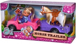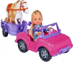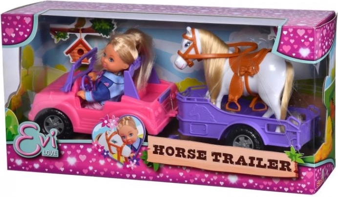 Acest set aduce copiilor tot ce le trebuie pentru aventuri ecvestre. Păpușa Evi Love conduce un cabrio roz stilat, tractând o remorcă mov pentru transportul confortabil al căluțului. Datorită roților care se învârt și remorcii detașabile, jocul este fluent și distractiv acasă sau în deplasare.