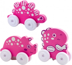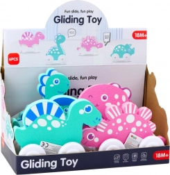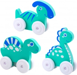 Dinozaurii colorați pe roți sunt proiectați pentru a oferi distracție copiilor. Au un aspect prietenos, forme rotunjite și culori pastelate care stimulează imaginația. Datorită roților, jucăriile se mișcă ușor și construcția lor lejeră permite copiilor să le împingă cu ușurință și să le ia oriunde.
