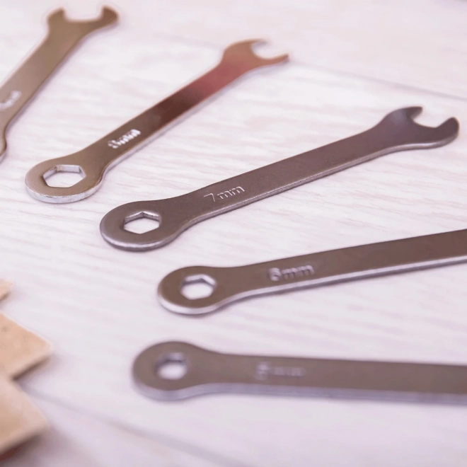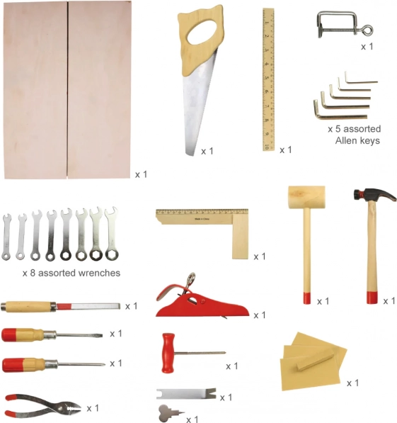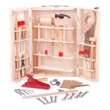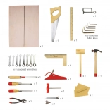 O valiză de lemn cu scule care conține tot ce îi trebuie unui tânăr meșter. Conține șurubelnițe, ferăstraie, chei, ciocane și multe alte unelte. Fabricat din materiale de înaltă calitate și respectă normele europene de siguranță.