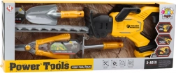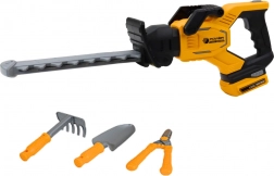 Setul de grădinărit pentru copii include o versiune realistă de jucărie a unei foarfece electrice de tuns gard viu cu lame de plastic mobile. Este suficient să apeși un buton și poți începe „tăierea” în siguranță! Foarfeca are un mâner ergonomic, un modul de baterie detașabil și elemente care imită funcționarea unui echipament de grădinărit real. Setul include de asemenea unelte de mână: greblă, lopățică și secător.