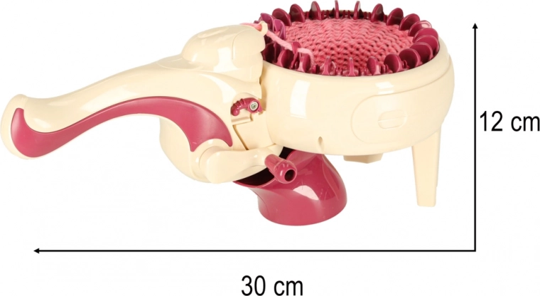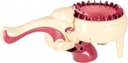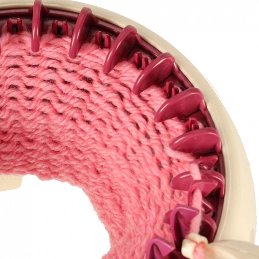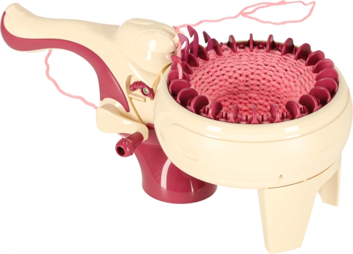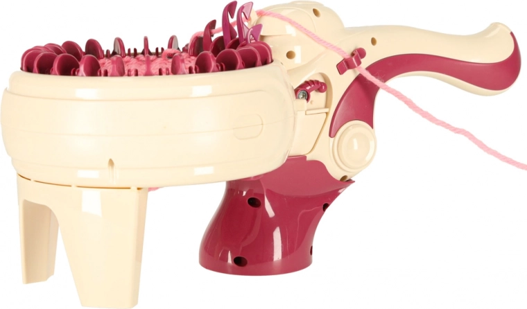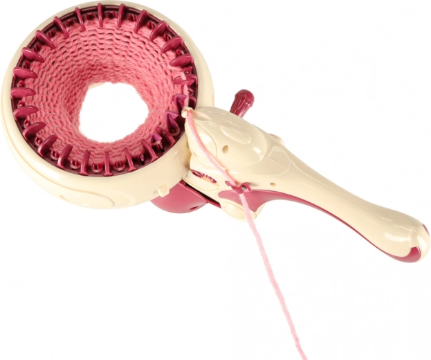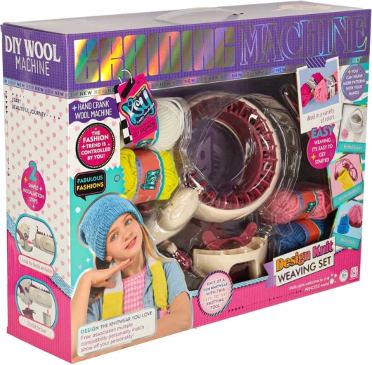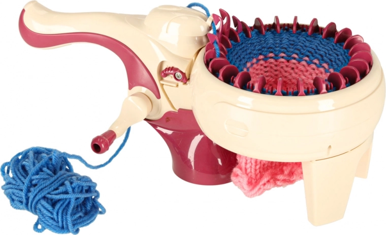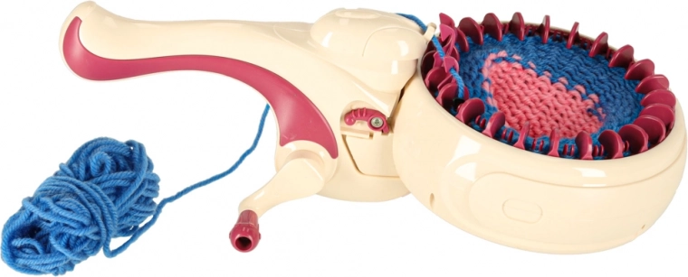 Cu mașina de tricotat integrată puteți tricota cu ușurință diverse proiecte, de la eșarfe până la căciuli. Setul conține tot ce aveți nevoie: 1 mașină de tricotat, bază de stabilizare, ac și croșetă. Paleta de culori a firelor include galben, albastru, alb, mov și roz, permițând o gamă largă de combinații și designuri.