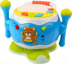 Această tobă muzicală oferă 8 moduri de joc diferite: cântat la tobă, ascultare muzică, cântece educative, povești și quiz-uri. Dispune de butoane colorate cu imagini de animale, panou tactil luminos, microfon interactiv și două bețe de tobe drăguțe. Totul este inclus într-o structură stabilă și colorată cu un design adorabil de ursuleț.