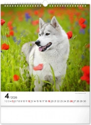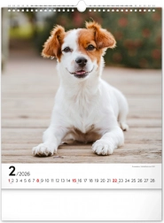 Calendar de perete Câini 2026 este alegerea ideală pentru iubitorii de câini. Oferă imagini frumoase ale douăsprezece rase de câini diferite pe un fundal alb.
