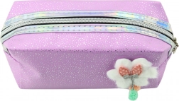 Husa cosmetică stilată este un accesoriu unic pentru echipamentul școlar sau pentru uzul de zi cu zi. Realizată într-o nuanță mov de efect, decorată cu particule fine, sclipitoare, atrage atenția prin designul său inconfundabil. Pe partea frontală se află o aplicație drăguță în formă de nor pufoșel cu fundiță, la care sunt atașate două biluțe decorative ce conferă întregului ansamblu un farmec aparte.