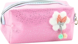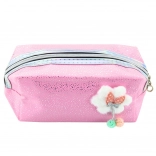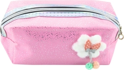 Acest penar pentru cosmetice sau rechizite școlare este realizat într-o nuanță elegantă de roz și decorat cu sclipici fin. Pe partea din față se află o aplicație drăguță în formă de nor pufoșel cu fundiță, de care sunt atașate două biluțe decorative ce conferă întregului aspect un farmec aparte.