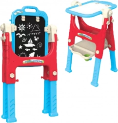 Înălțimea și unghiul tablei sunt ajustabile pentru a se potrivi înălțimii și vârstei copilului. Setul include toate accesoriile necesare: 12 creioane, 12 crete colorate, 4 markere pe bază de apă, 10 coli format A4 și un burete, împreună cu un organizator pentru accesorii. Baza stabilă și scăunelul solid asigură confort în timpul jocului creativ, dezvoltând abilitățile motorii fine și imaginația spațială.