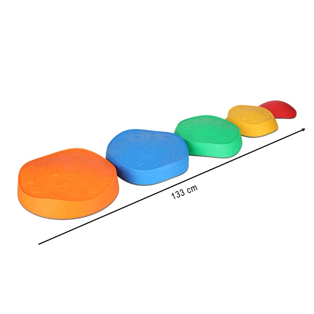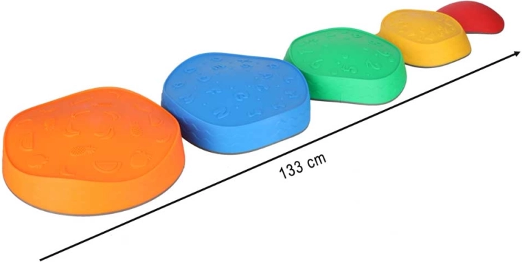 Datorită construcției solide și suporturilor antiderapante, pietrele rămân stabile pe diferite tipuri de pardoseli. Poliuretanul rezistent este plăcut la atingere și ușor de curățat. Motivele colorate (cifre, litere, forme, fructe, modele) sprijină învățarea prin joc și dezvoltarea motricității fine și grosiere.