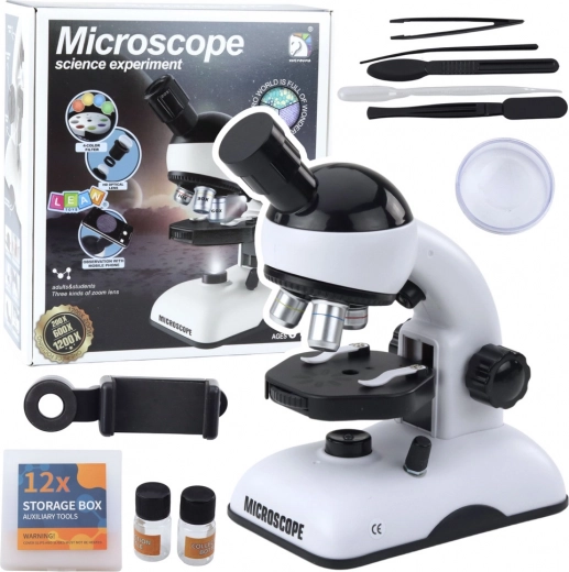 În plus, include un suport pentru telefon, care permite partajarea ușoară a imaginilor descoperite. Sunt incluse toate accesoriile necesare pentru primele experimente, inclusiv pensetă, lamele și instrumente de laborator.