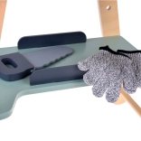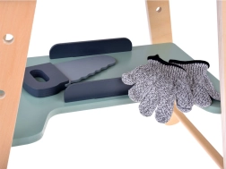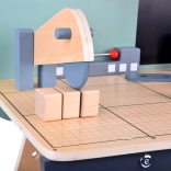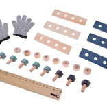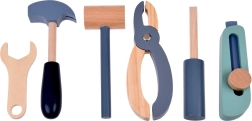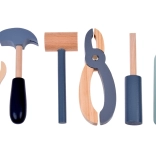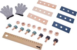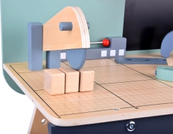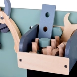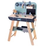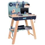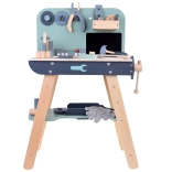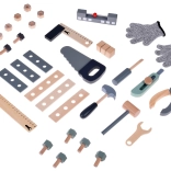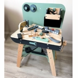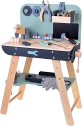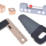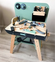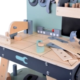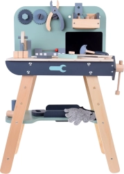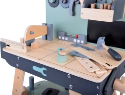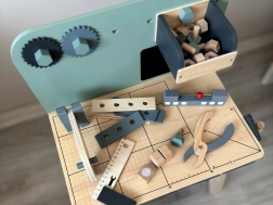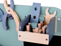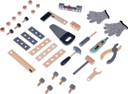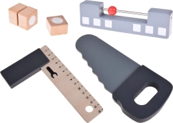 Setul este din lemn rezistent și conține unelte precum ciocane, chei, șurubelnițe și altele. Toate elementele sunt sigure, rotunjite și create cu atenție la detalii. Spațiul de lucru este, de asemenea, echipat cu o mică tablă de cretă pentru proiectare.
