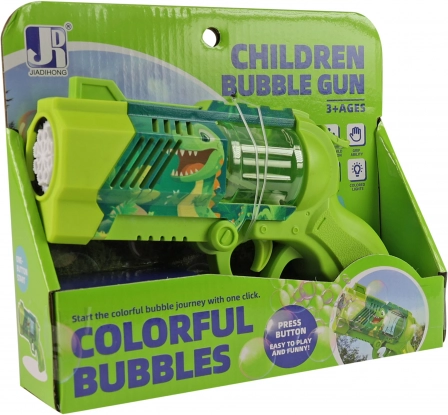 Pistol verde cu bule dinozaur cu efect luminos. Creează o mulțime de bule, ideal pentru copii. Funcționează cu 4× baterii AA. Soluția nu este inclusă.