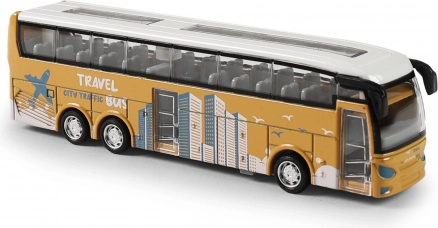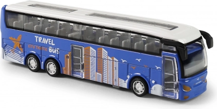 Mini autobuz metalic de lungă distanță cu mers liber și uși care se deschid, lungime 12 cm. Ideal pentru colecționari și iubitorii de modele.