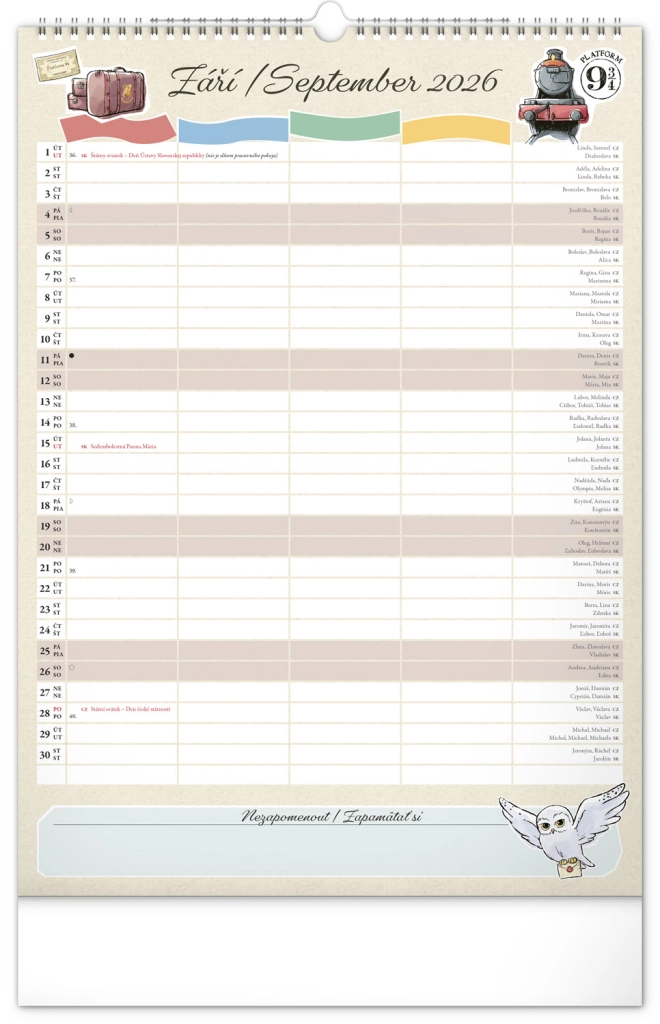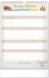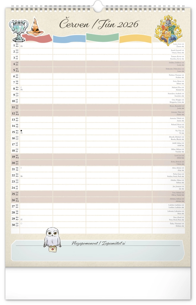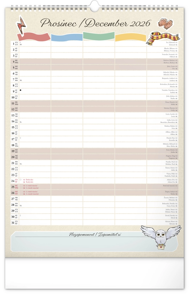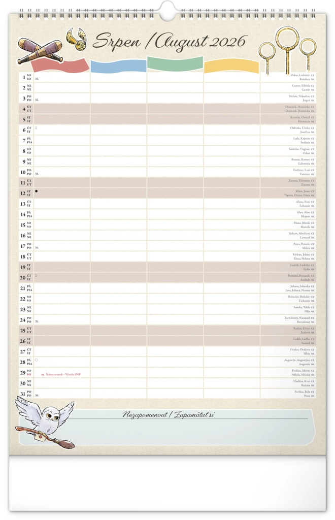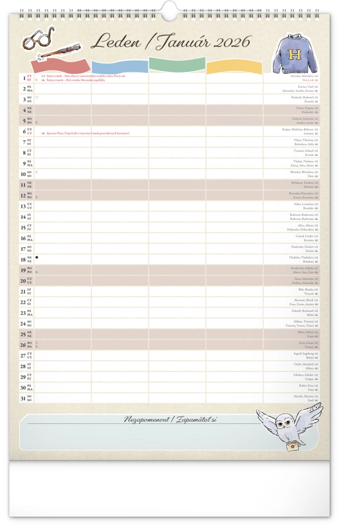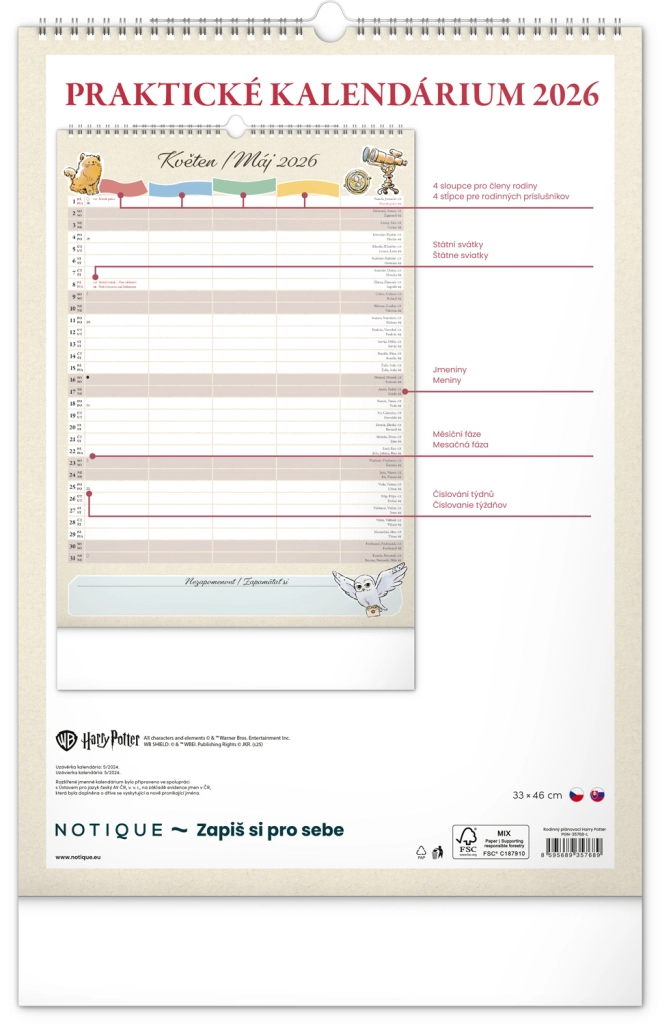 Introducem calendarul de perete pentru planificare familială, care aduce magia lumii lui Harry Potter în casa dvs. În fiecare lună vă puteți bucura de imagini și motive ale eroilor și locurilor preferate din lumea vrăjitorilor. Acest calendar nu uită de calendarul ceh și slovac, include sărbători naționale și fazele lunii și este un ajutor ideal pentru organizarea activităților pentru amatori și vrăjitori.