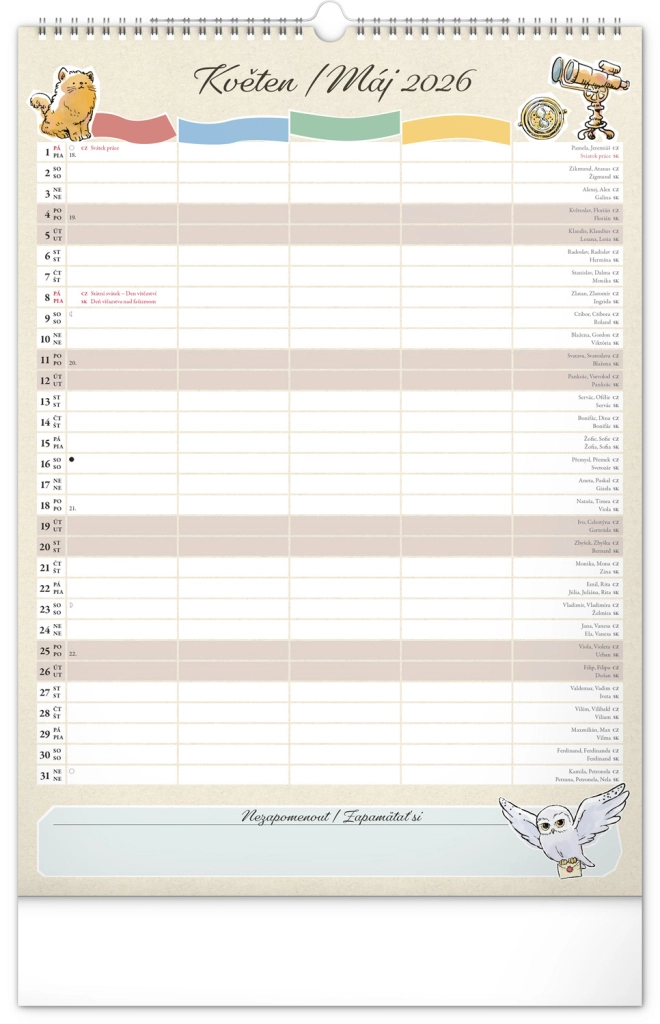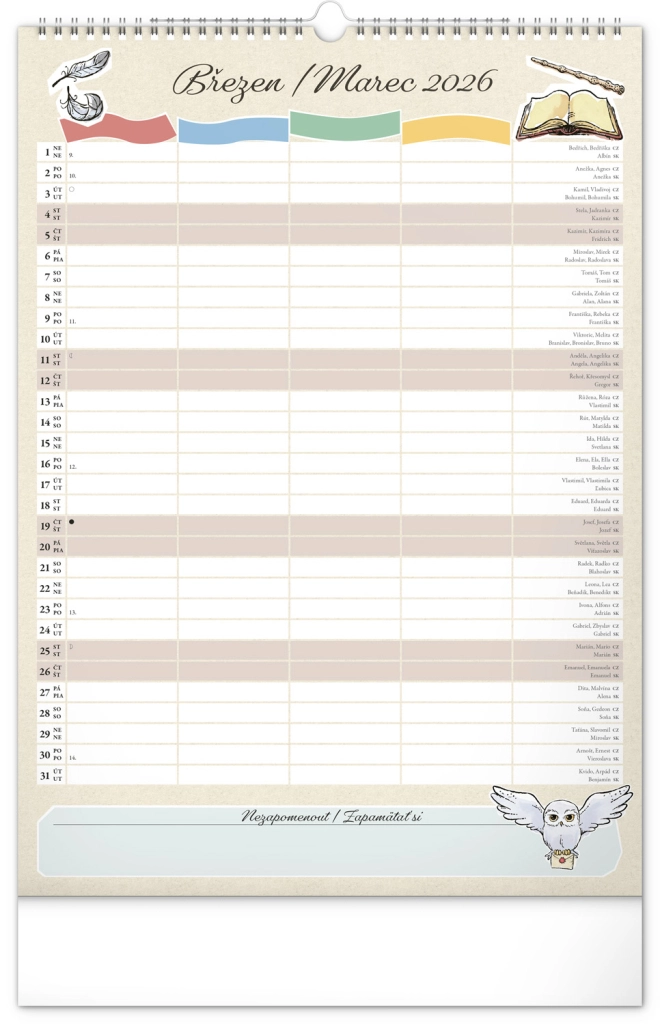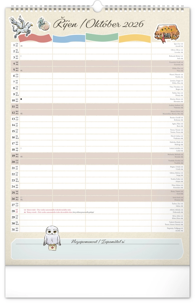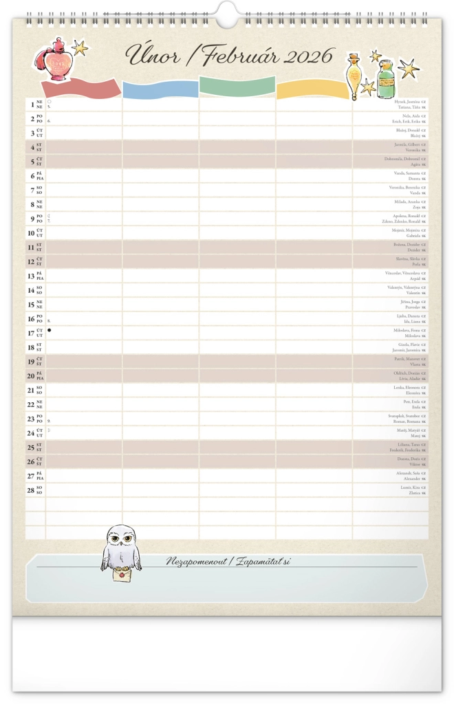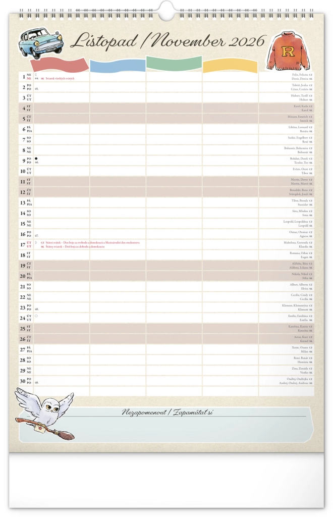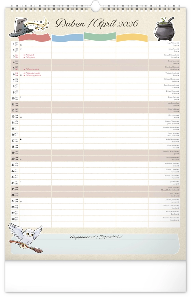 Introducem calendarul de perete pentru planificare familială, care aduce magia lumii lui Harry Potter în casa dvs. În fiecare lună vă puteți bucura de imagini și motive ale eroilor și locurilor preferate din lumea vrăjitorilor. Acest calendar nu uită de calendarul ceh și slovac, include sărbători naționale și fazele lunii și este un ajutor ideal pentru organizarea activităților pentru amatori și vrăjitori.