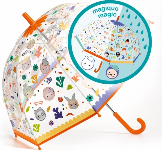 Umbrelă excelentă pentru copii, marca Djeco, care îi surprinde pe micii utilizatori cu schimbări distractive de culori. Umbrela cu motiv de fețe este proiectată să își schimbe culorile la contactul cu apa, transformând fiecare ploaie într-un moment magic: