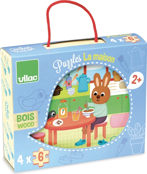 Descoperă puzzle-urile din lemn VILAC cu tematică de casă, ideale pentru cei mici de la 2 ani. Pachetul conține 4 puzzle-uri separate a câte 6 piese într-o cutie practică din lemn cu mâner din bumbac. O alegere excelentă pentru dezvoltarea motricității fine, a logicii și a capacității de concentrare a copiilor.